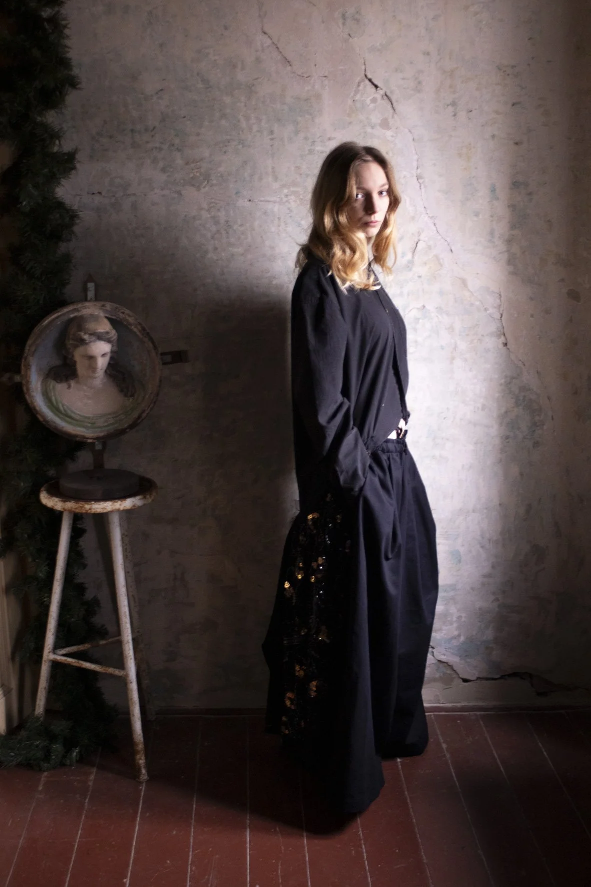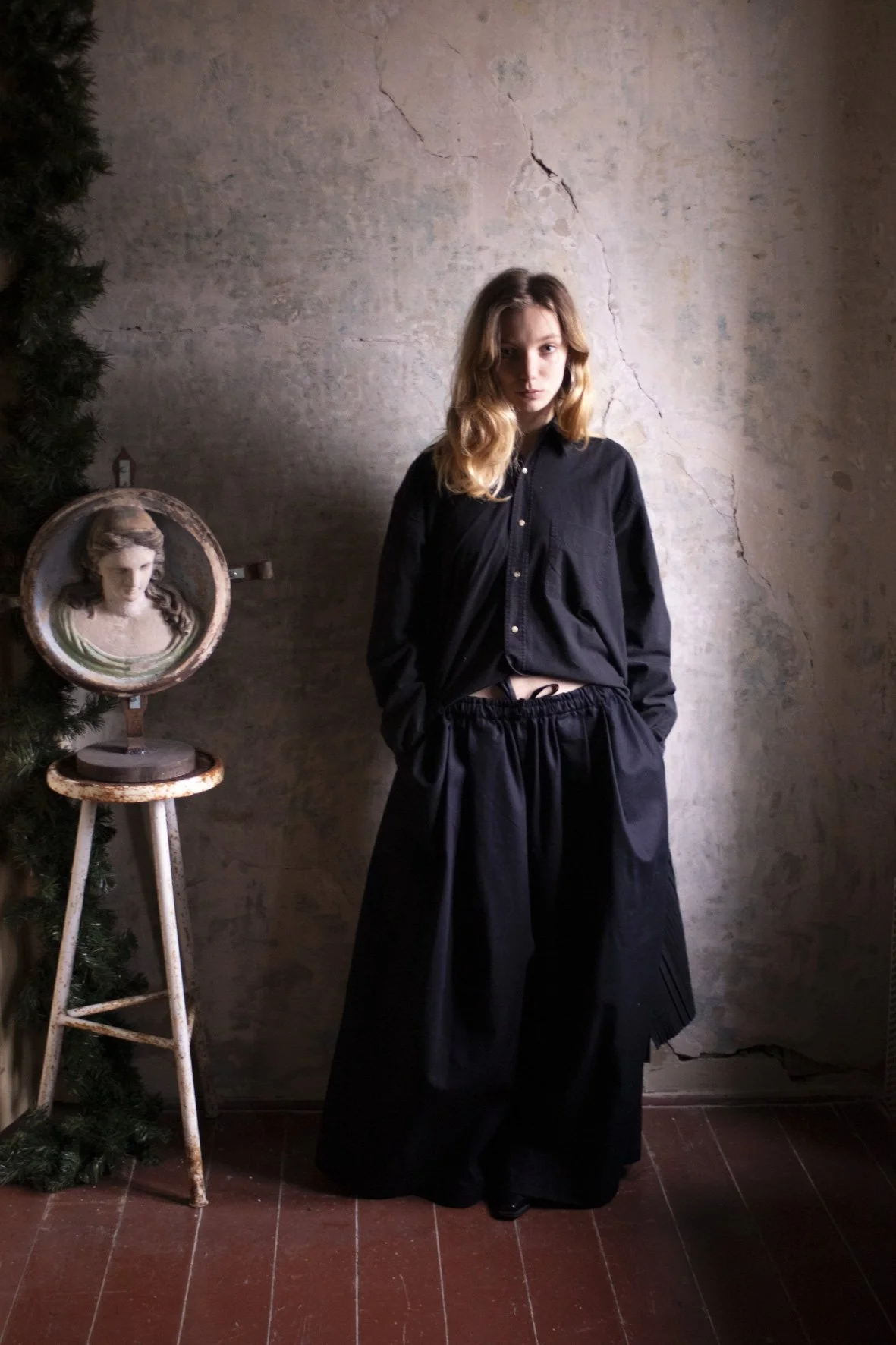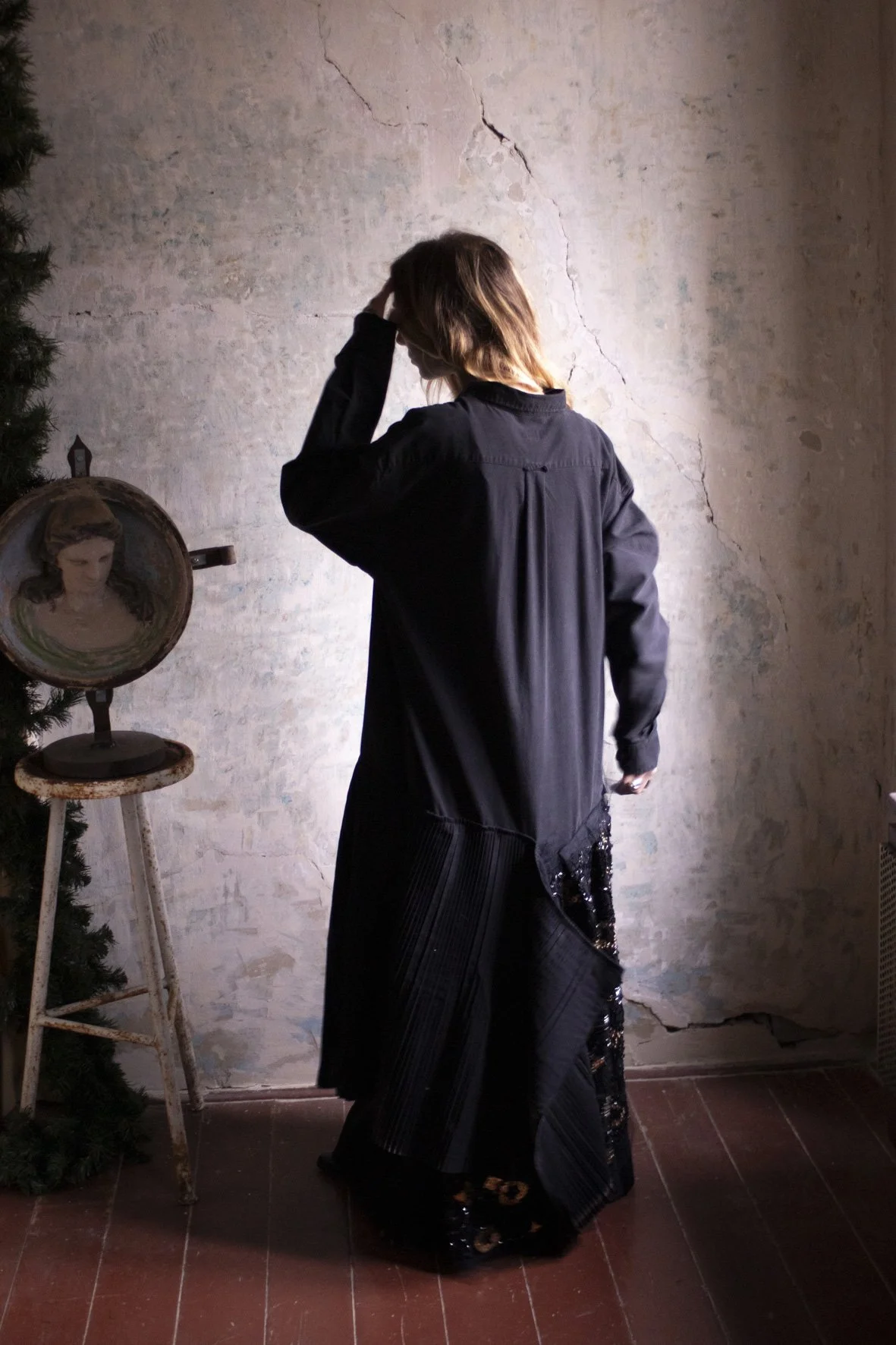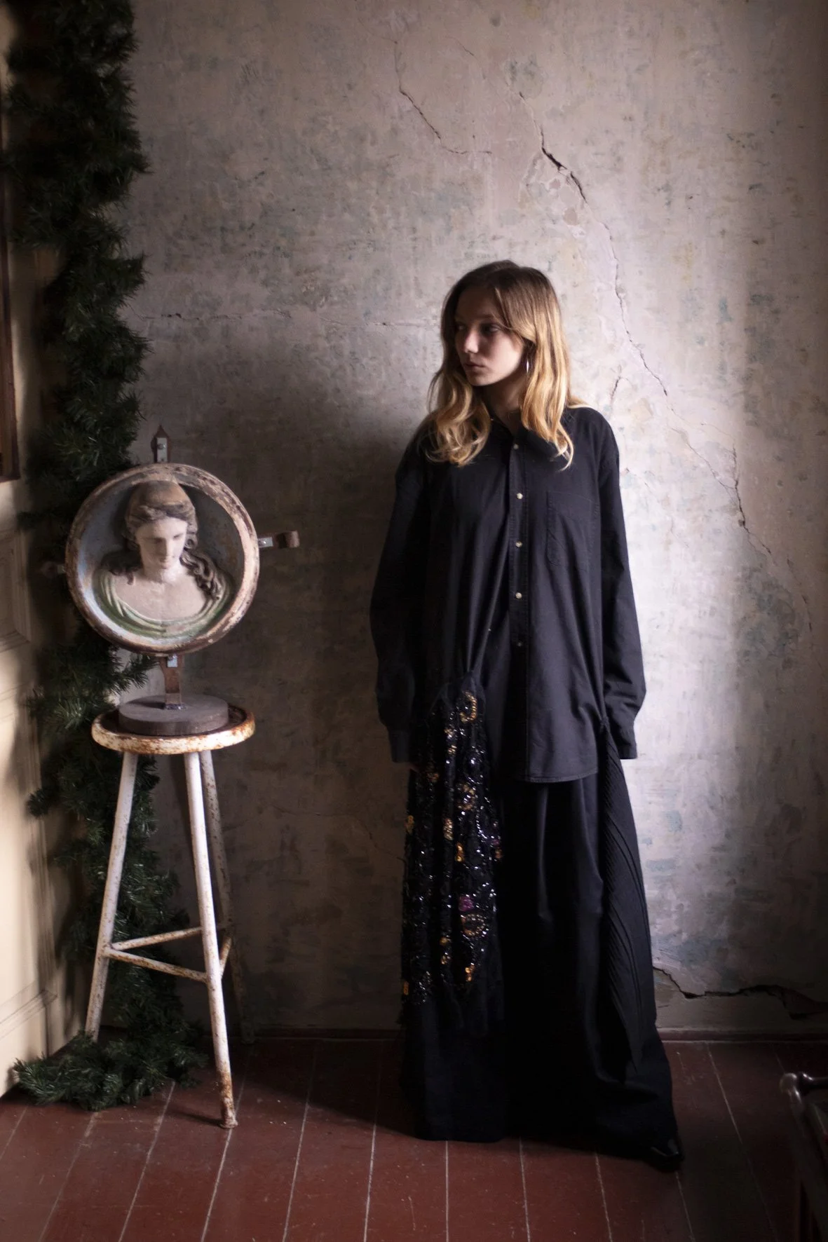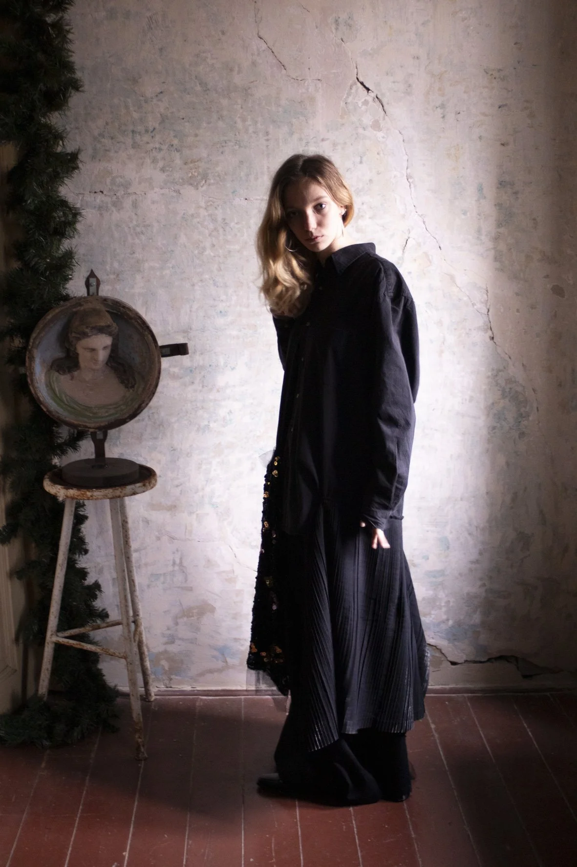 Oversize black shirt with embroidered and pleated bottom parts. Fabric of the shirt is cotton, the bottom is mixed polyester, silk and wool. This is a unique piece.
