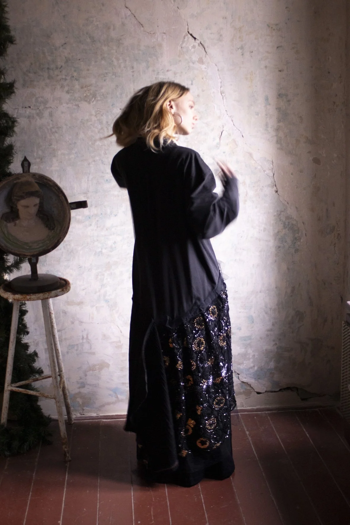 Fekete ing, gyöngyökkel es flitterekkel hímzett, valamint pliszírozott alsó résszel. Anyaga: ing: pamut, also rész polyester, selyem és gyapjú. Egyedi darab.