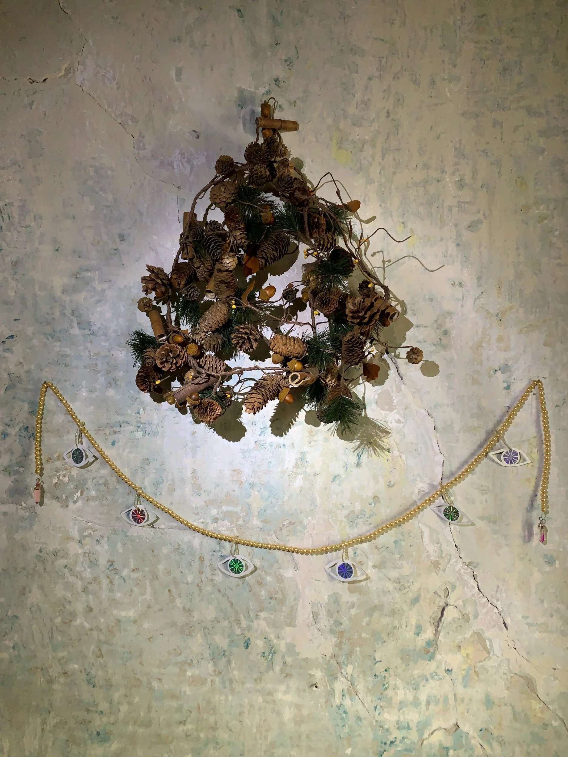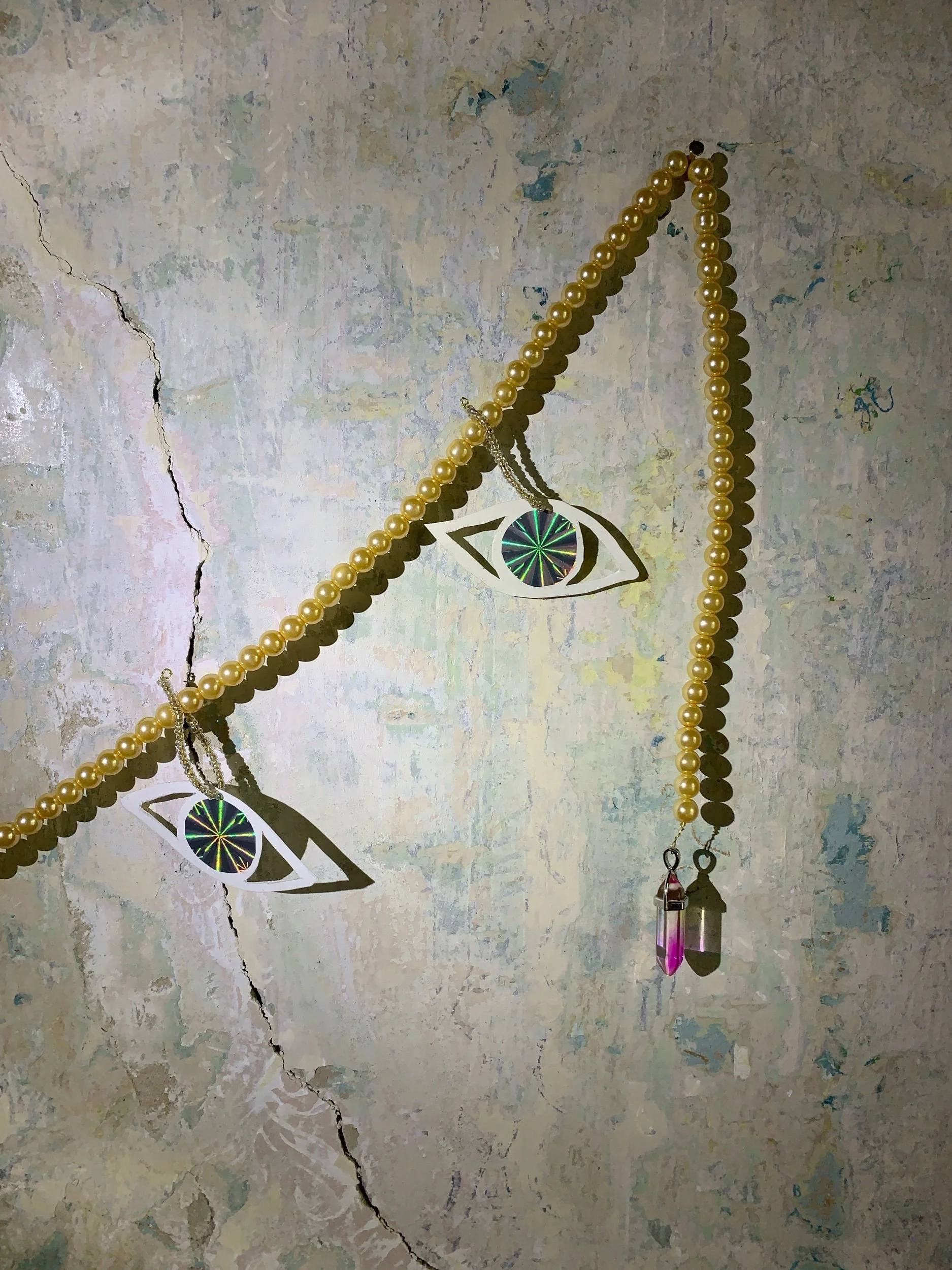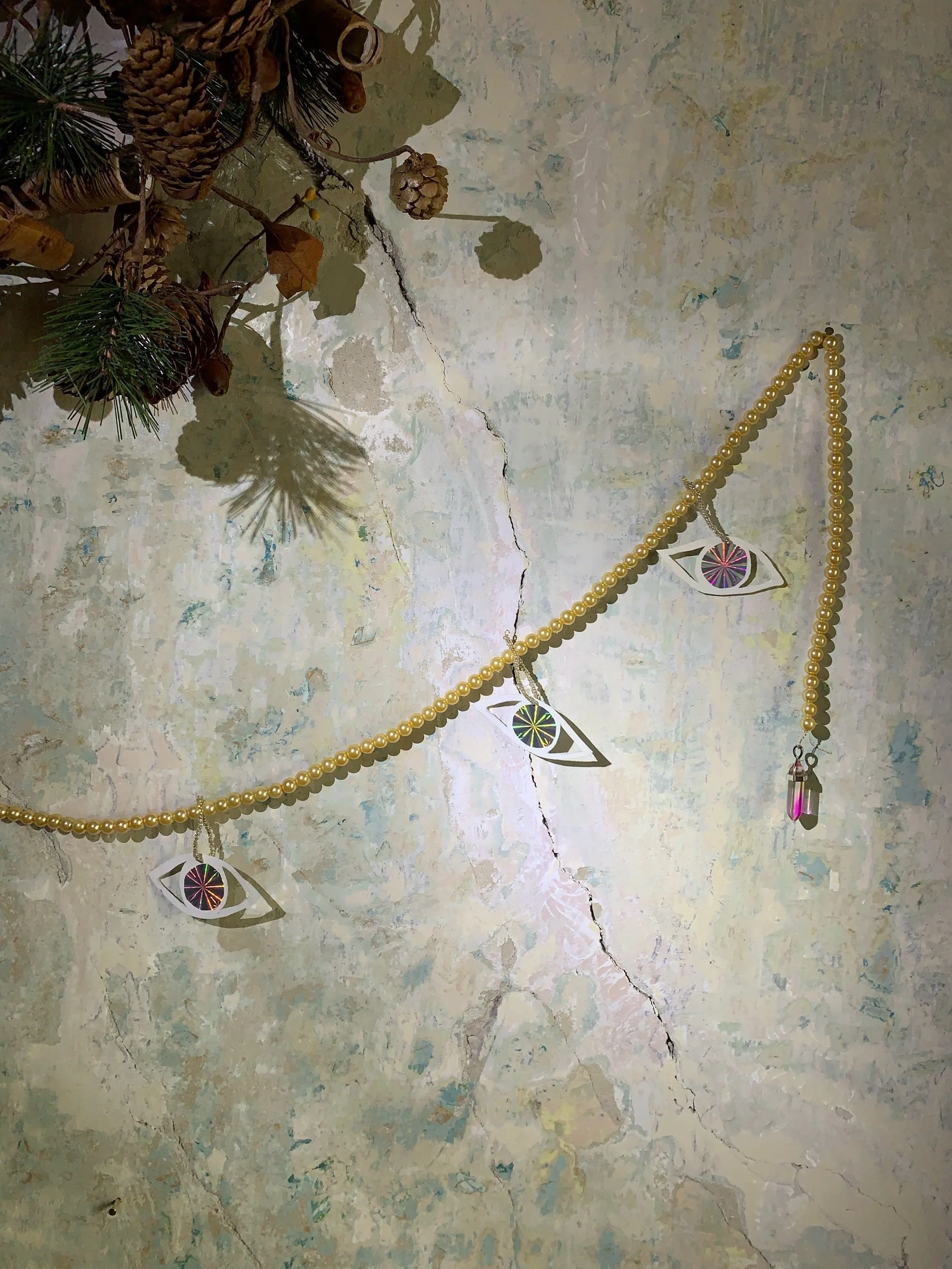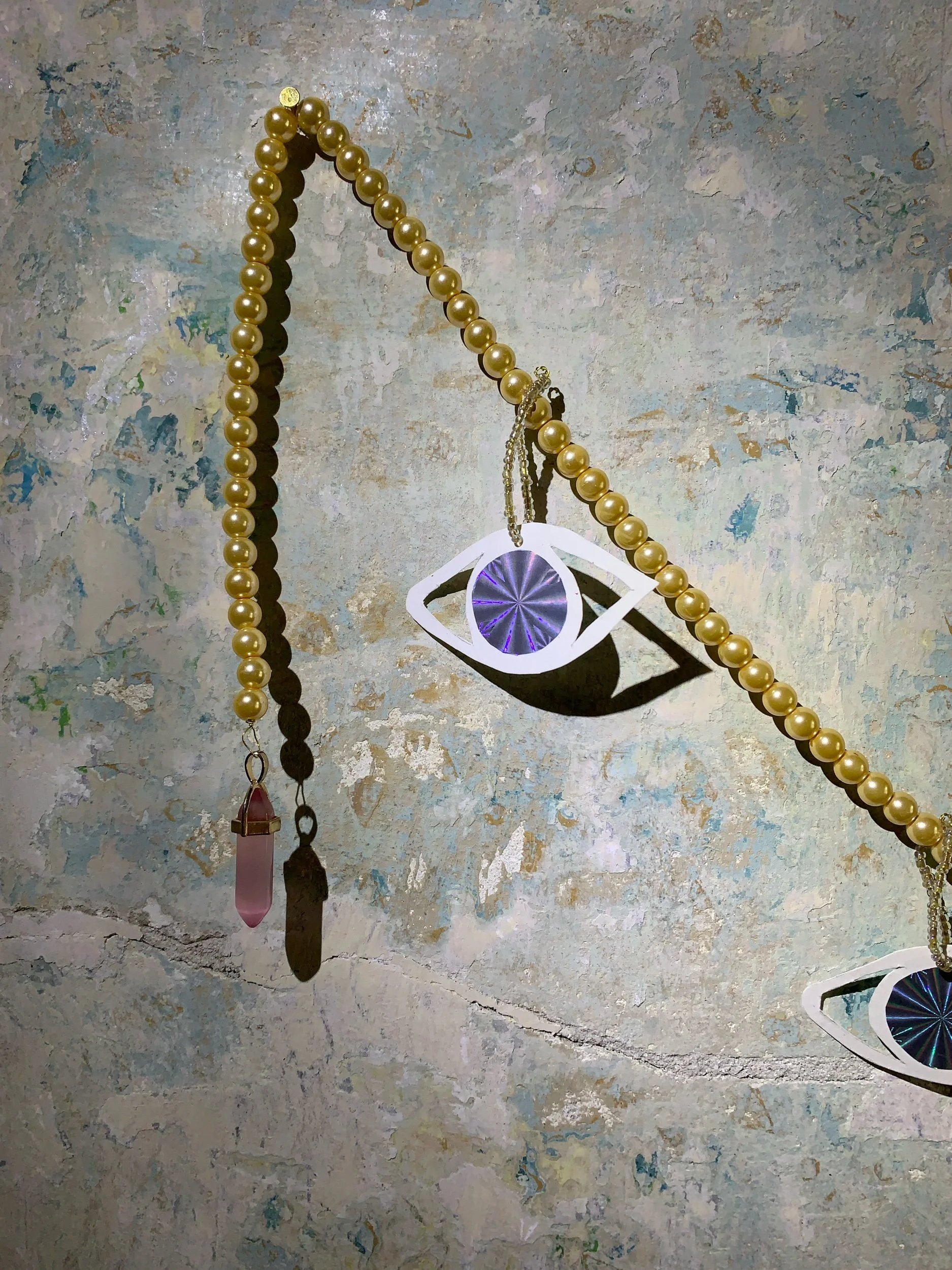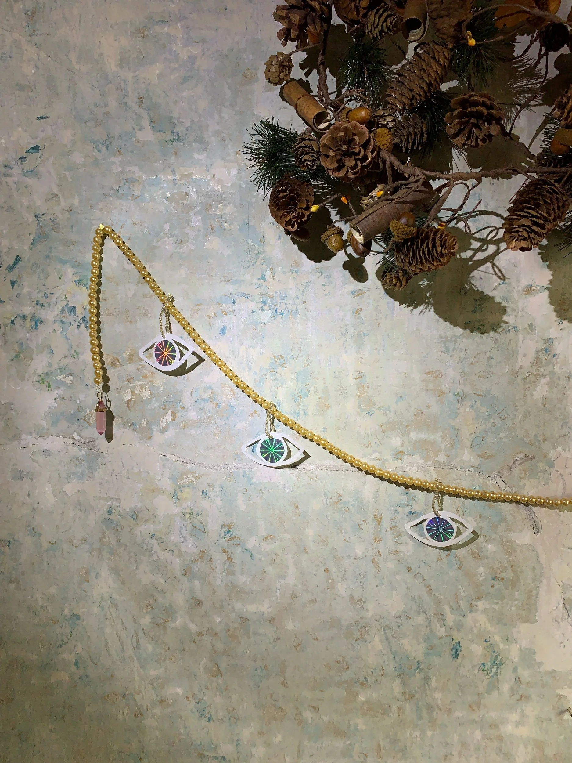 Home decoration made with beads with six paper eyes. 150 cms long