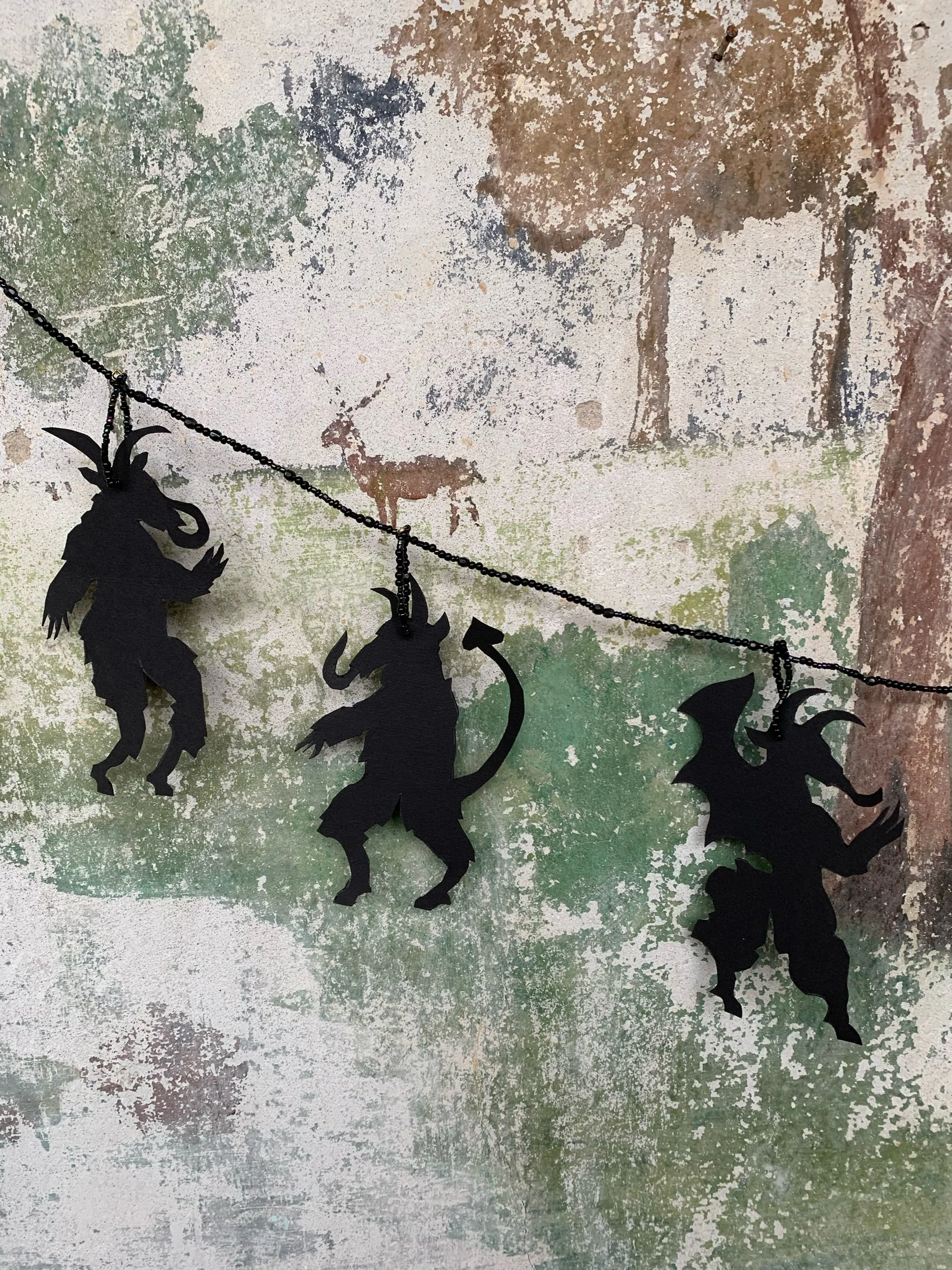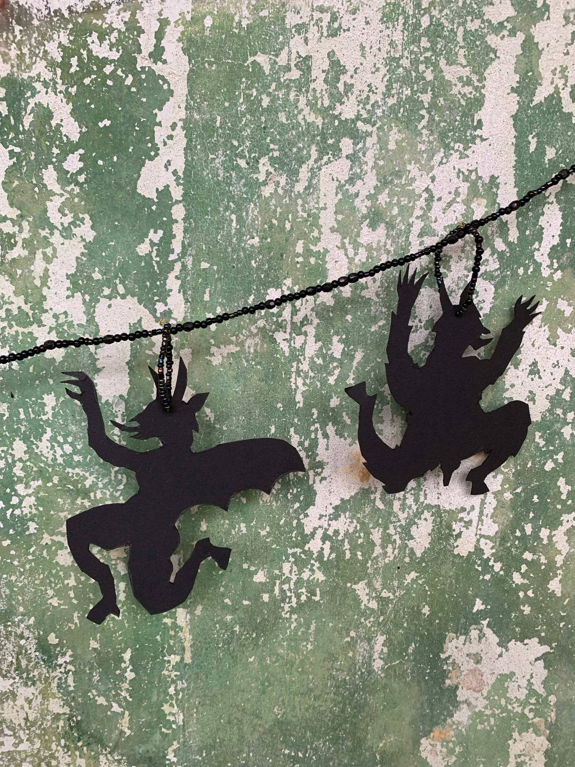 Fekete gyöngyökből fűzött dekoráció hét papír ördög figurával.