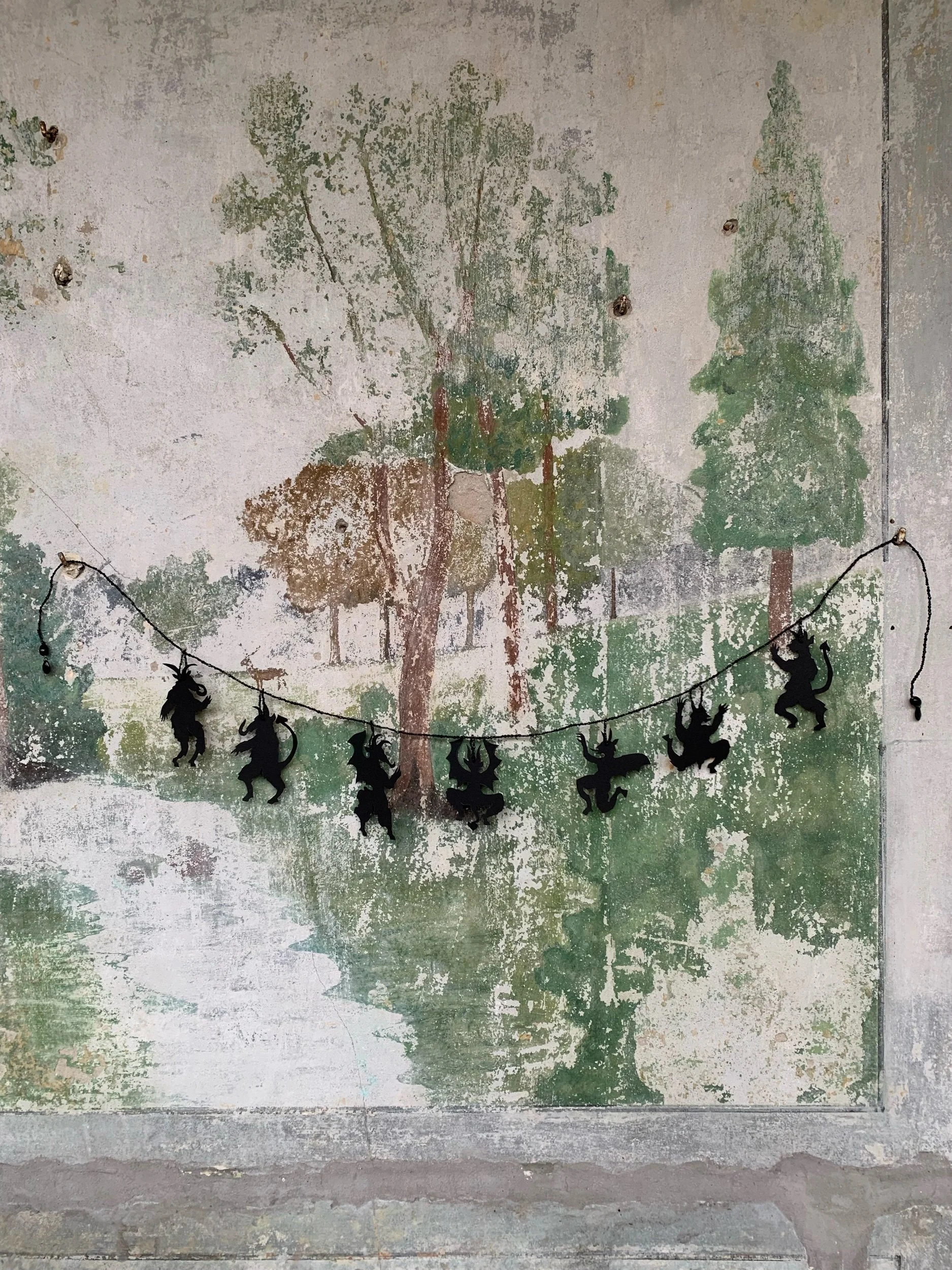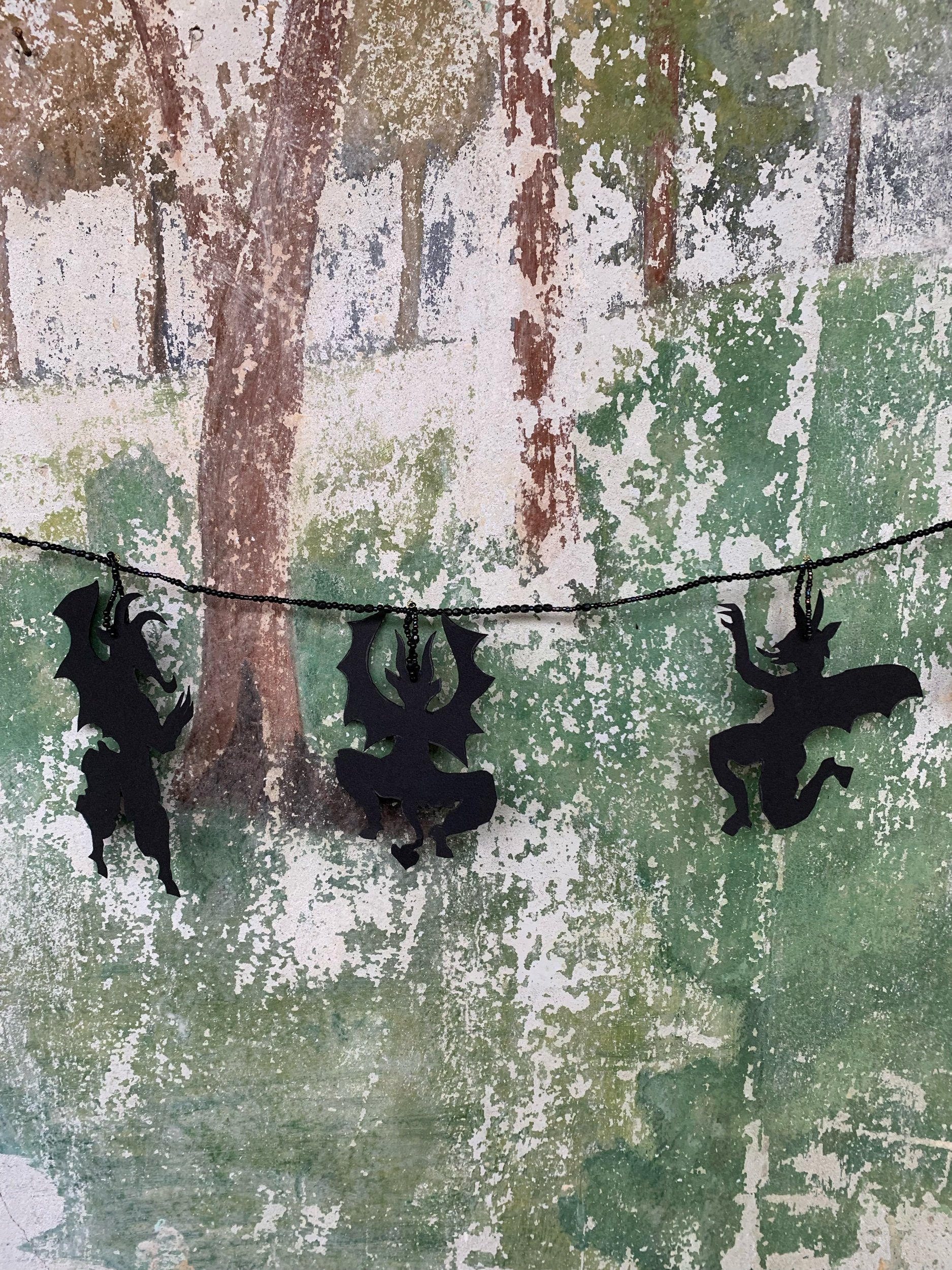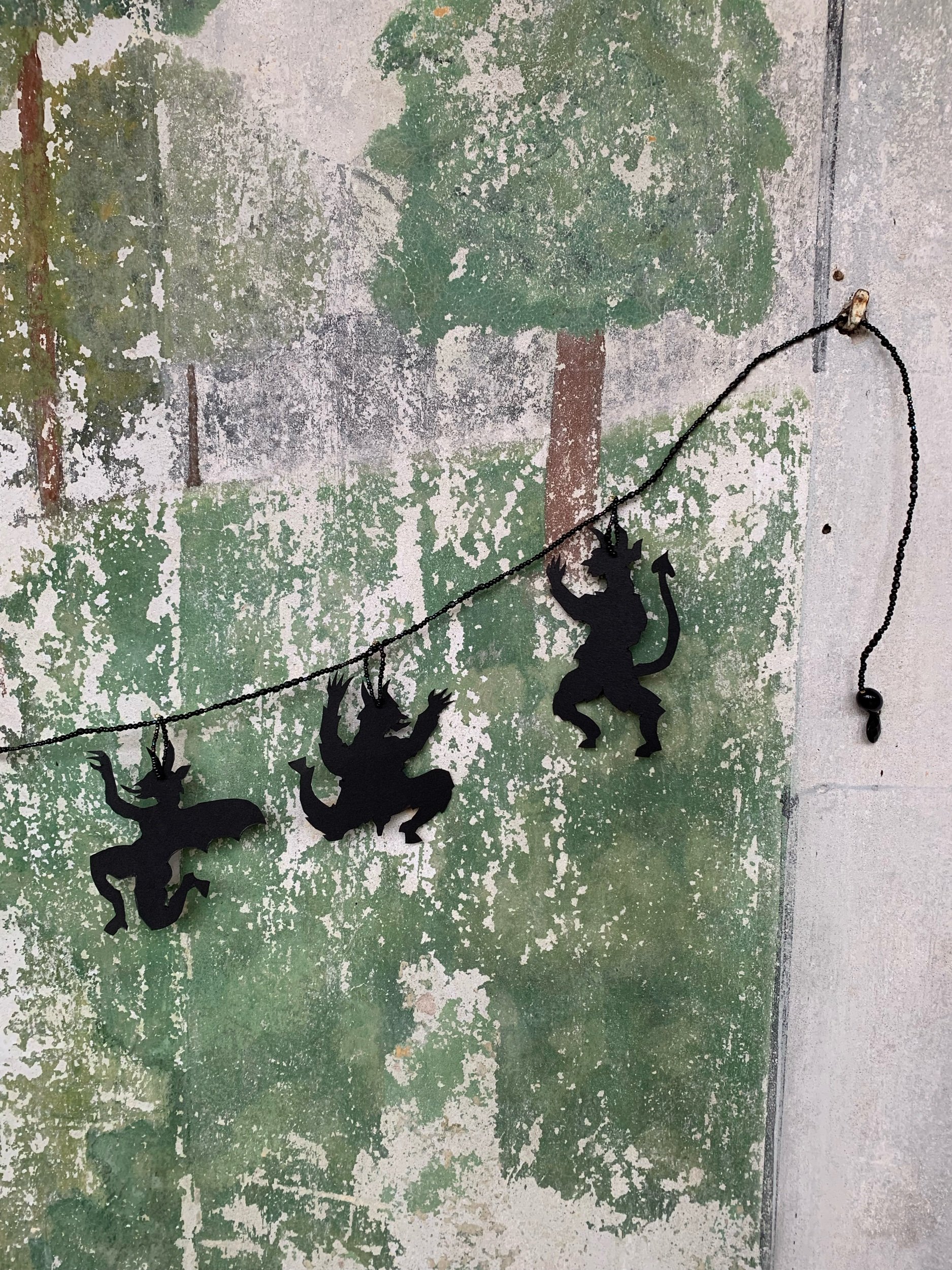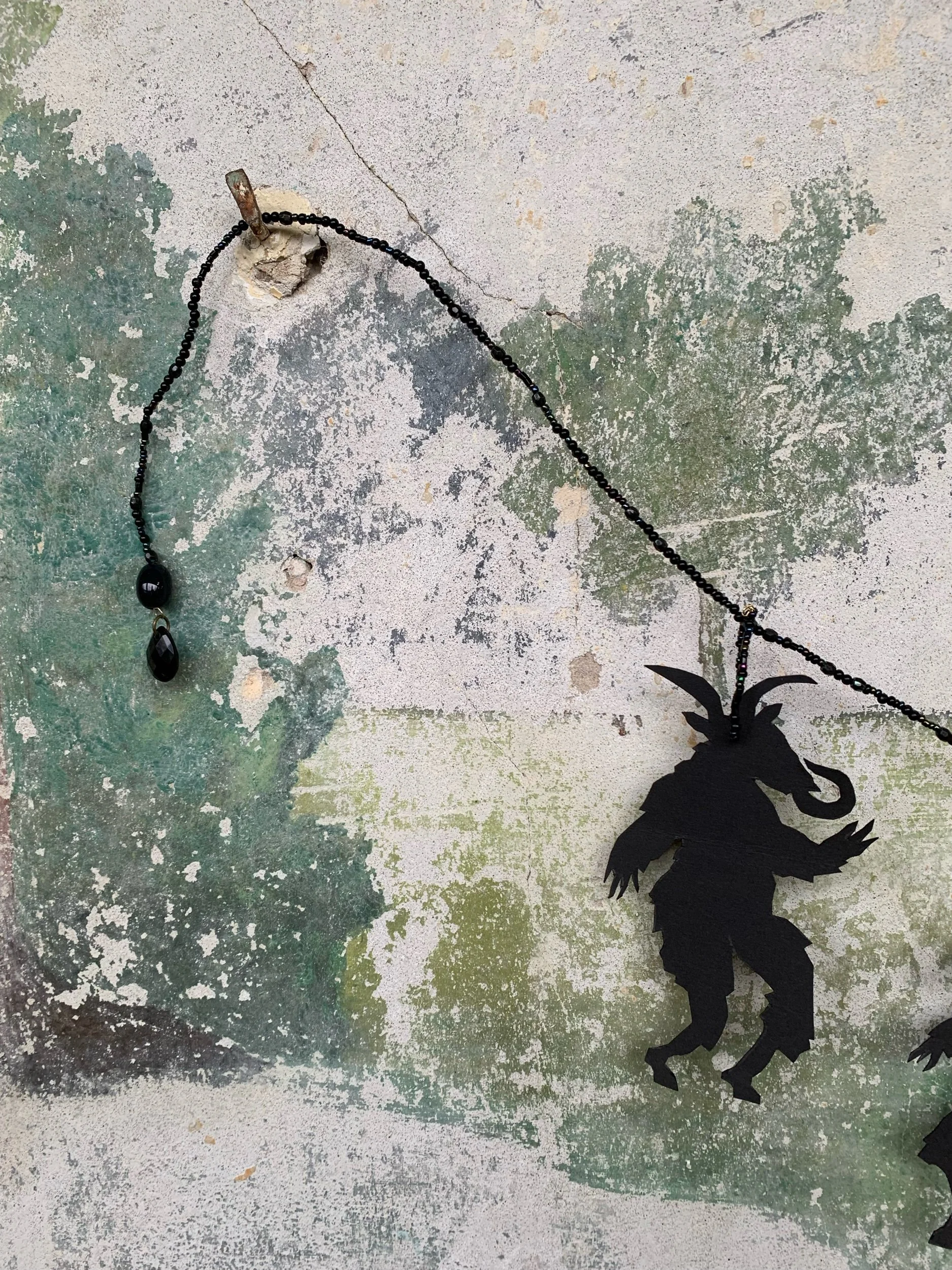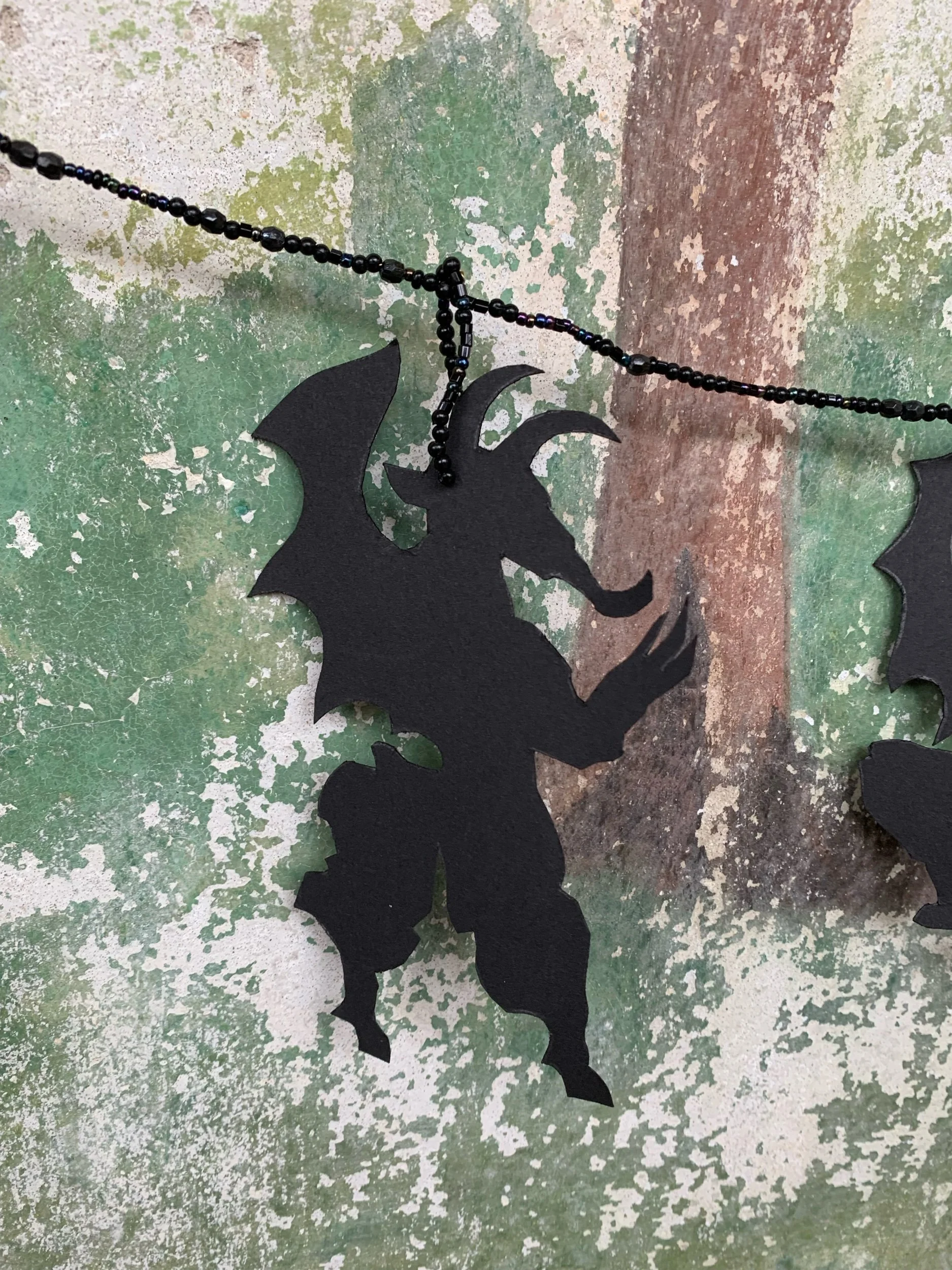 Home decoration made with black beads with seven paper devils. 150 cms long