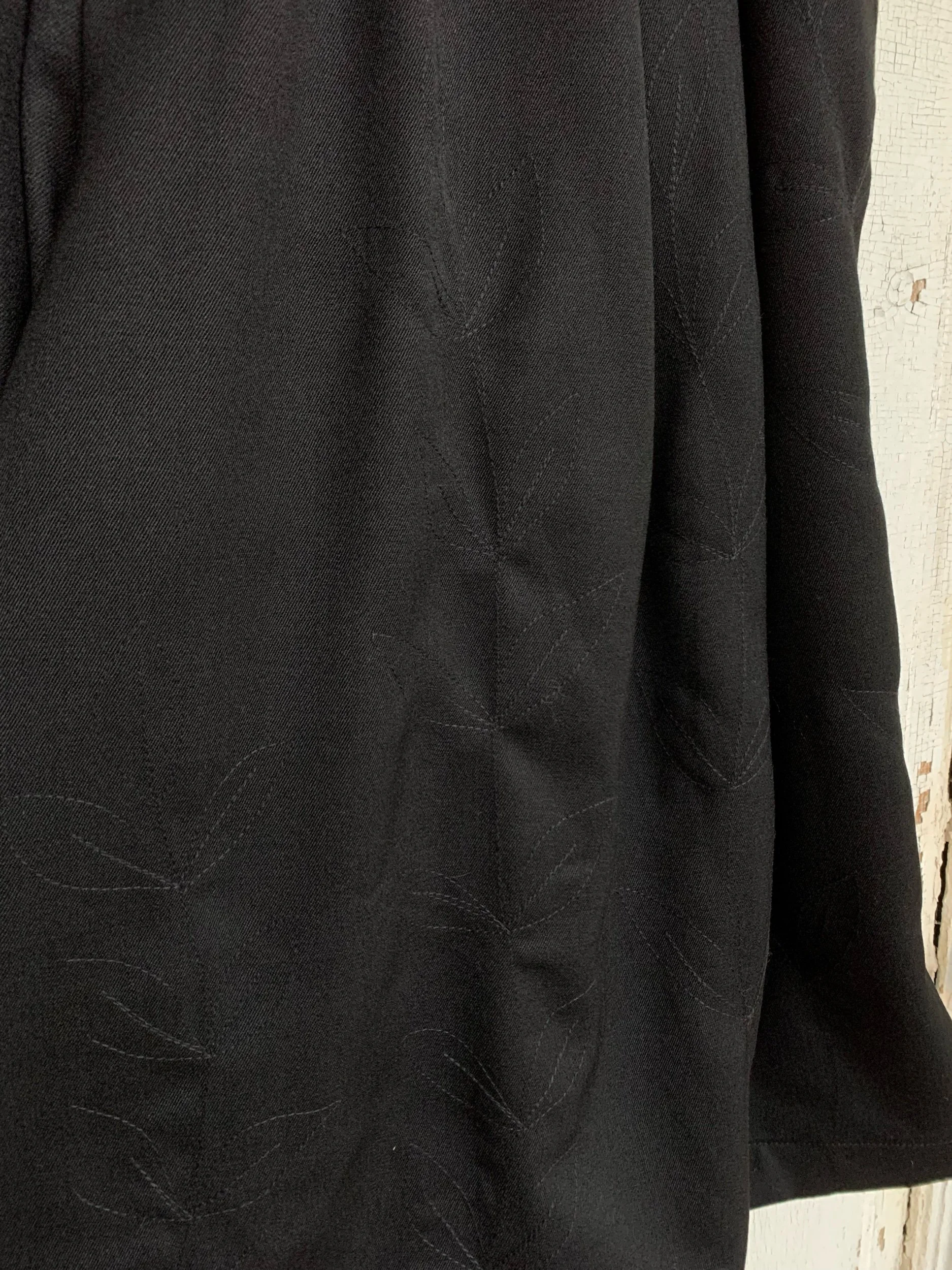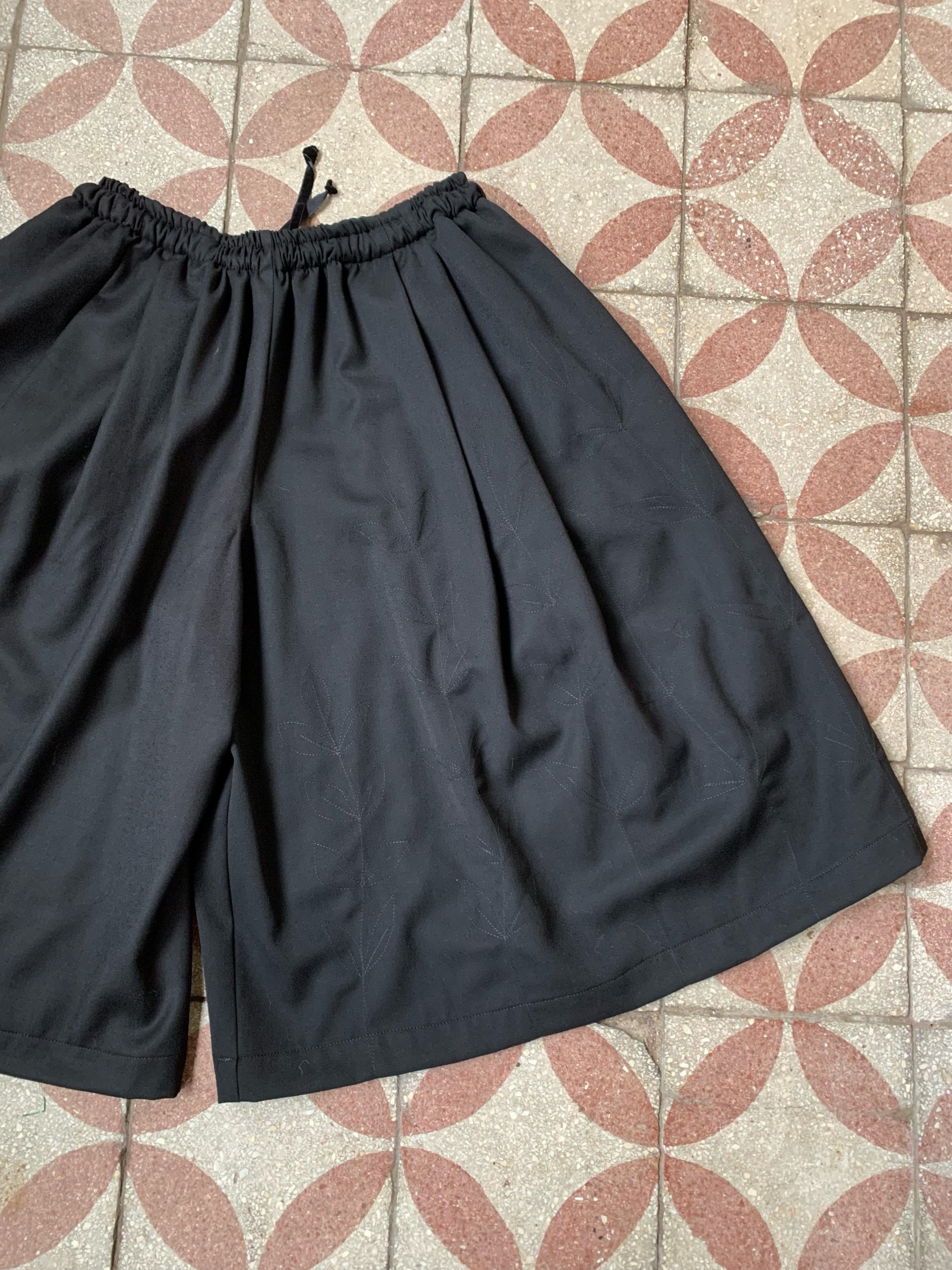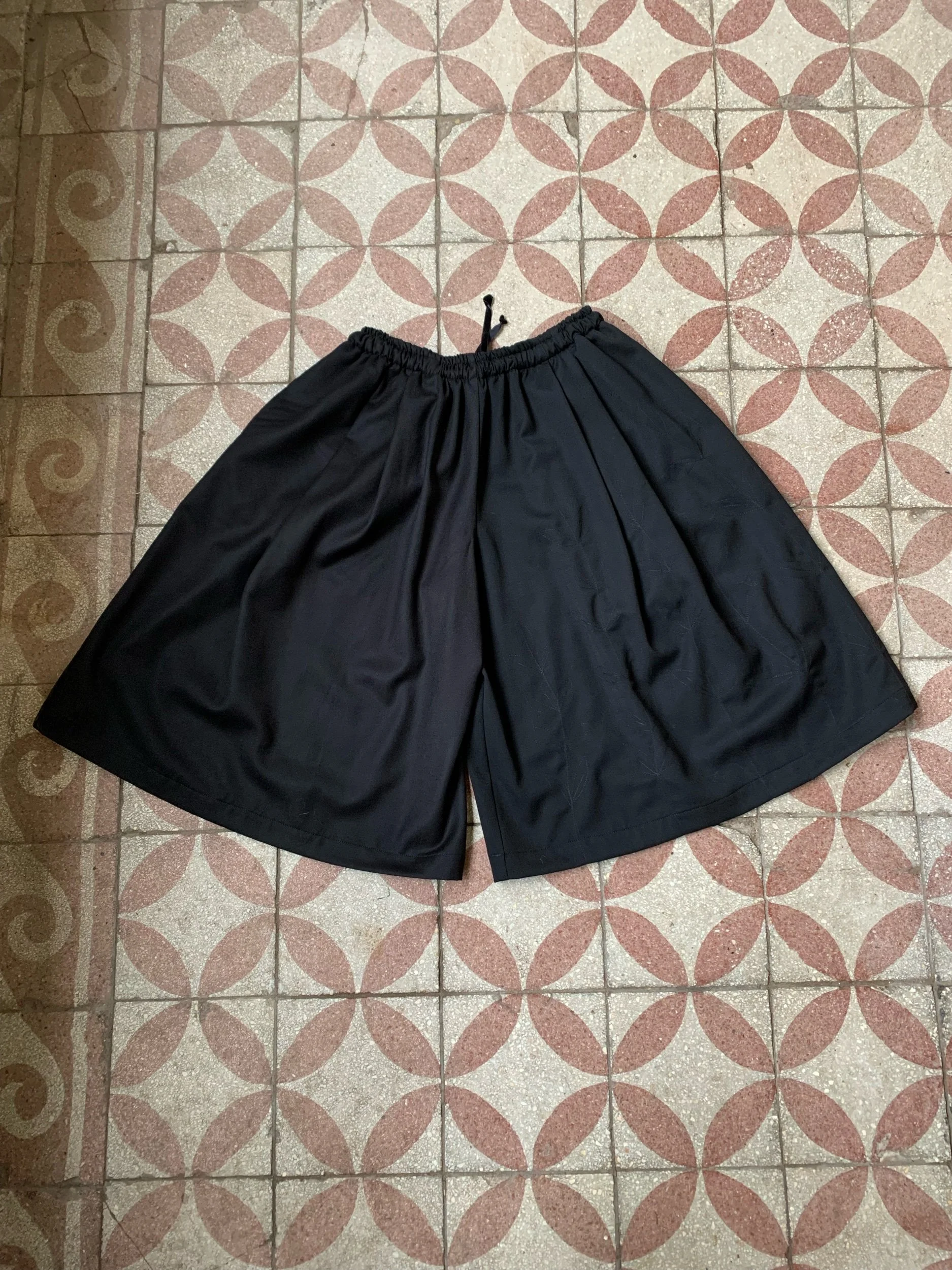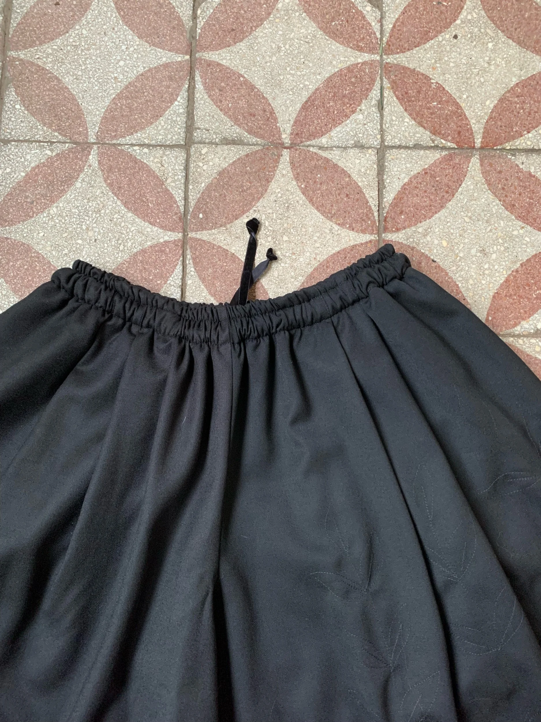 Black trousers with pleats and with elastic waistband. Fabric is wool. This is a unique piece.