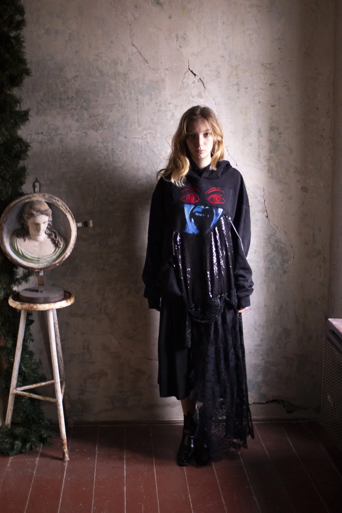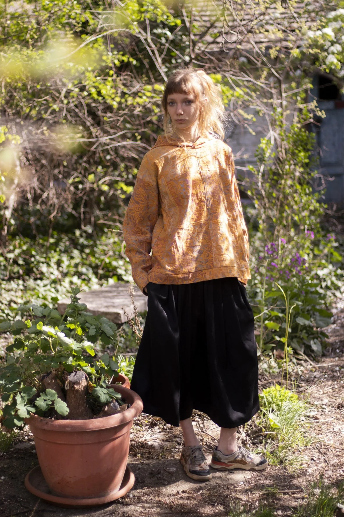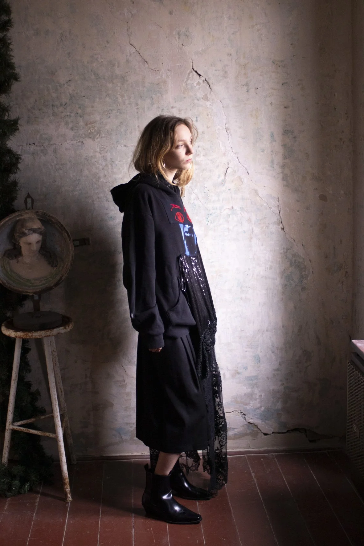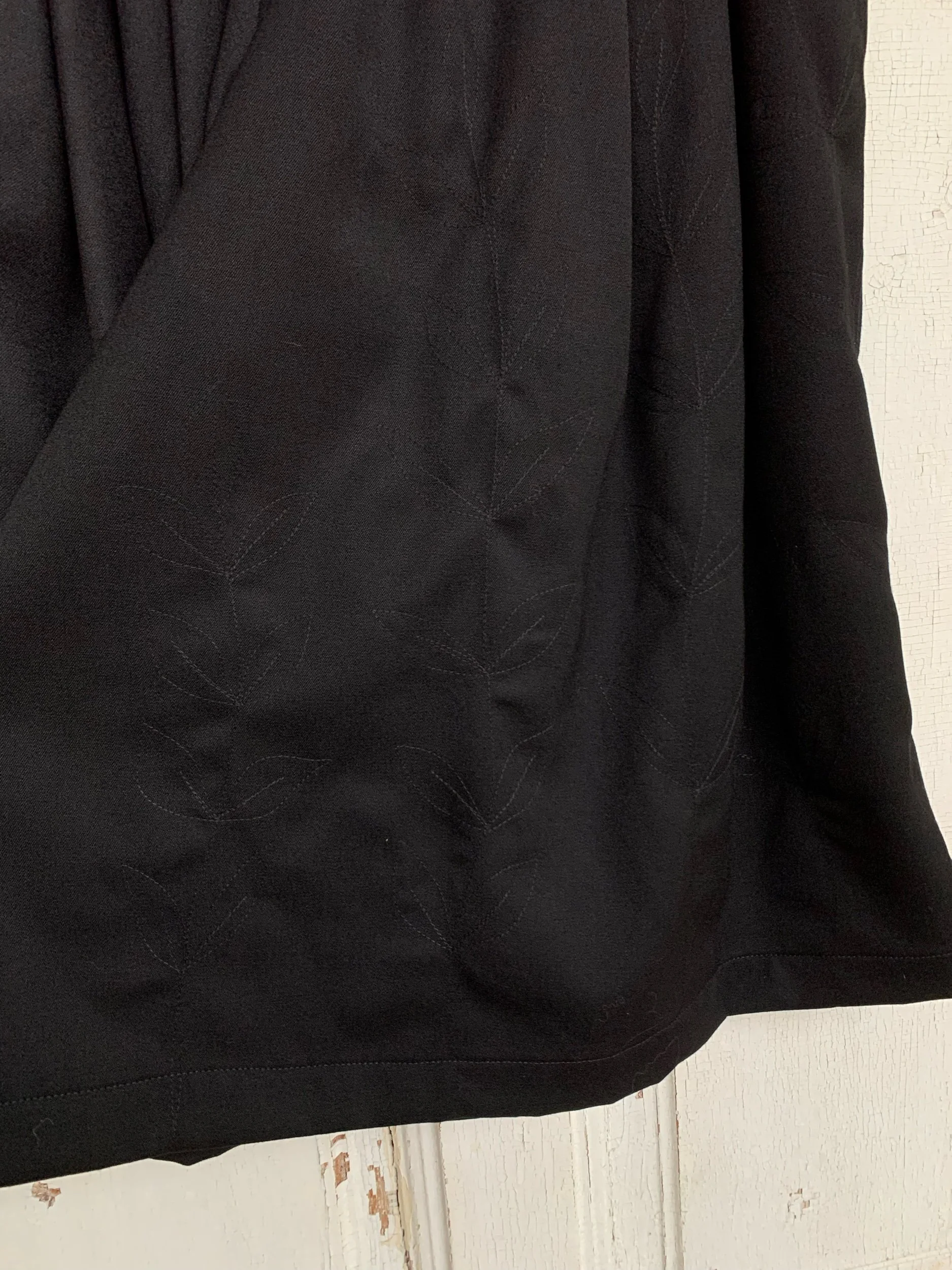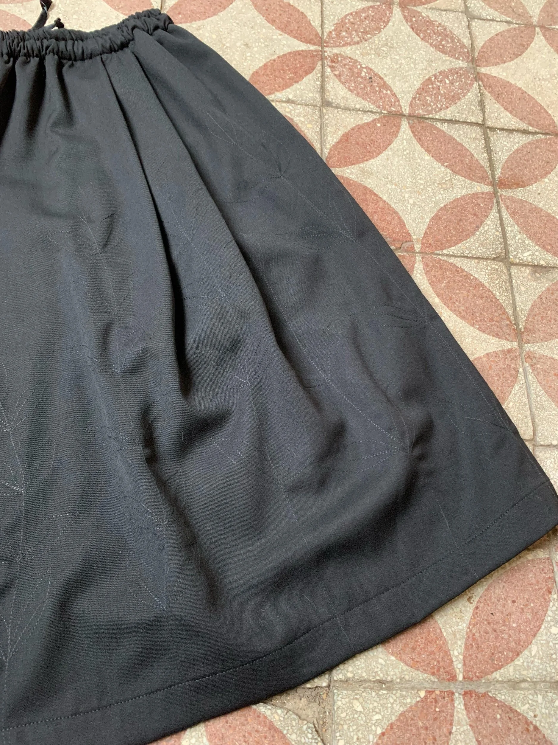 Black trousers with pleats and with elastic waistband. Fabric is wool. This is a unique piece.