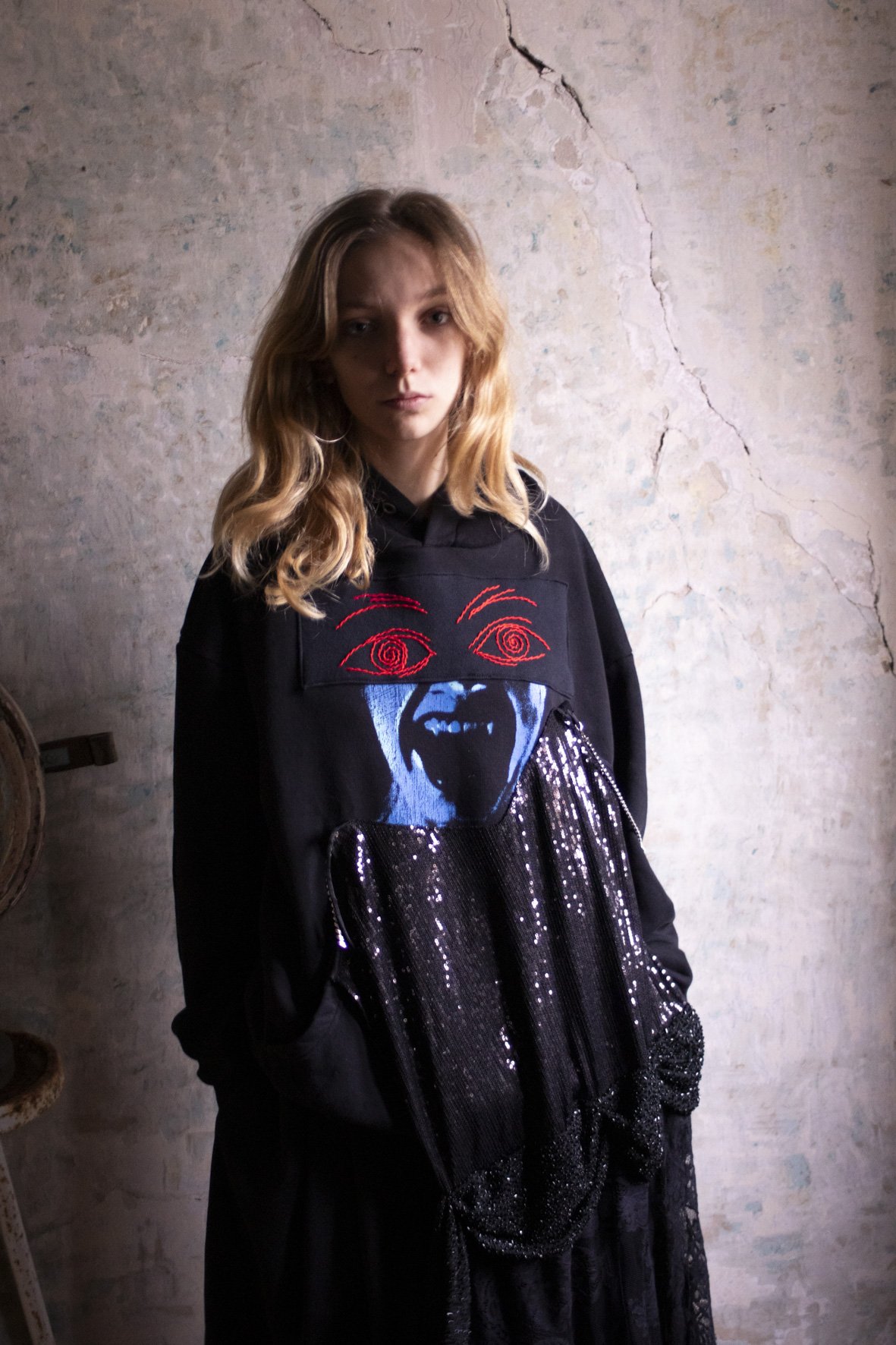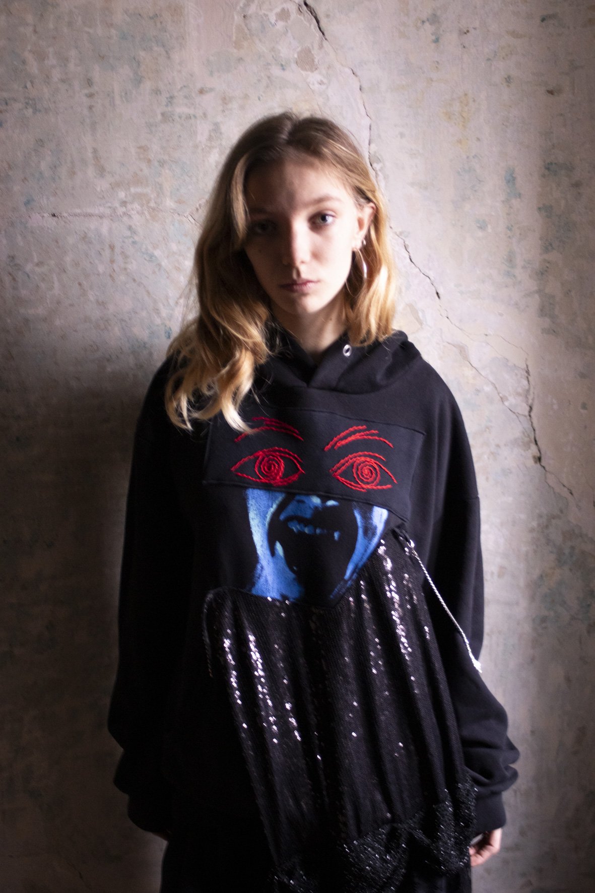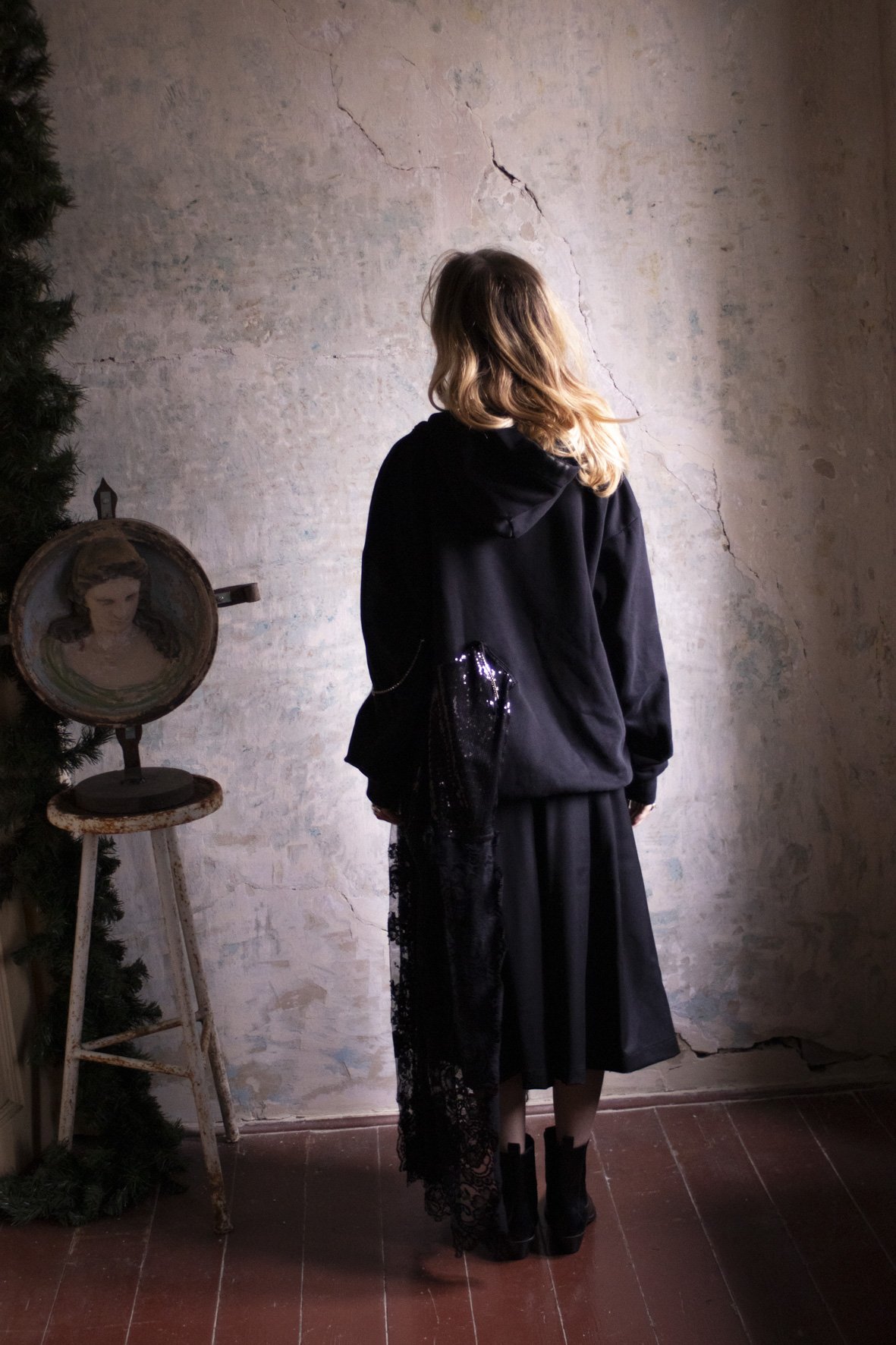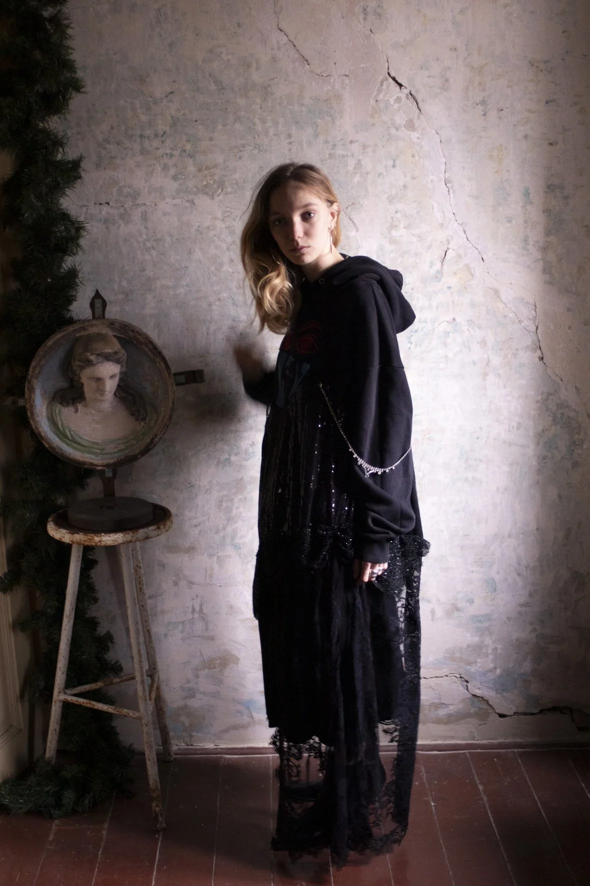 Deconstructed black dress with a hoodie and a dress with sequins and lace. Fabric is cotton and polyester. This is a unique piece.