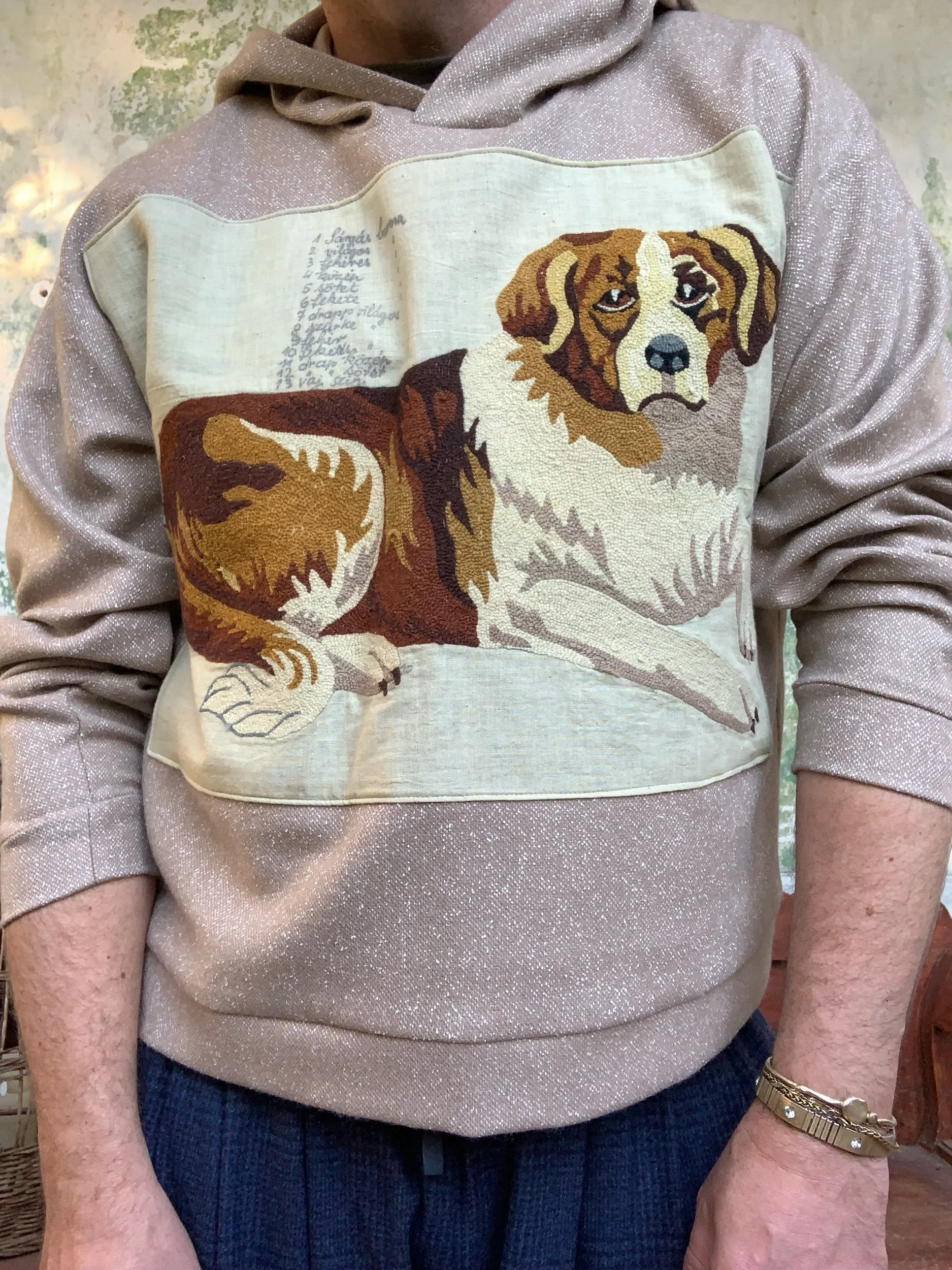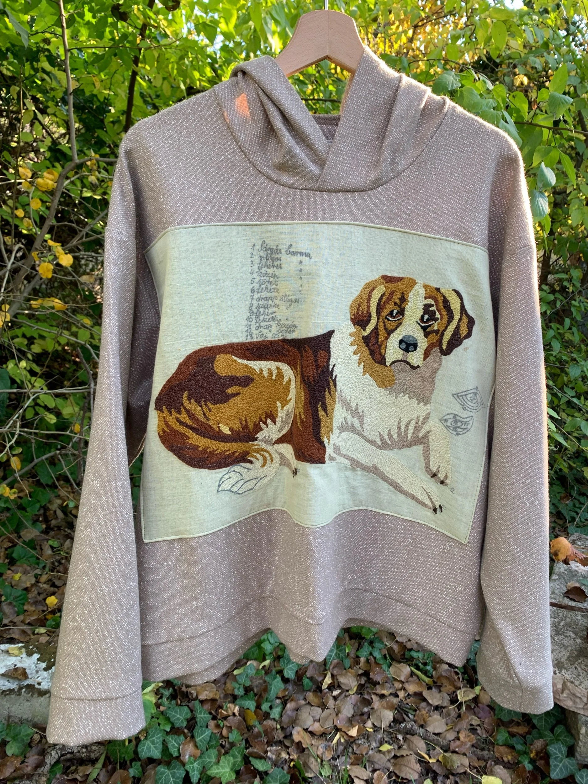 Oversize hoodie with hand made embroidery. Fabric is mixed wool and polyester. This is a unique piece.