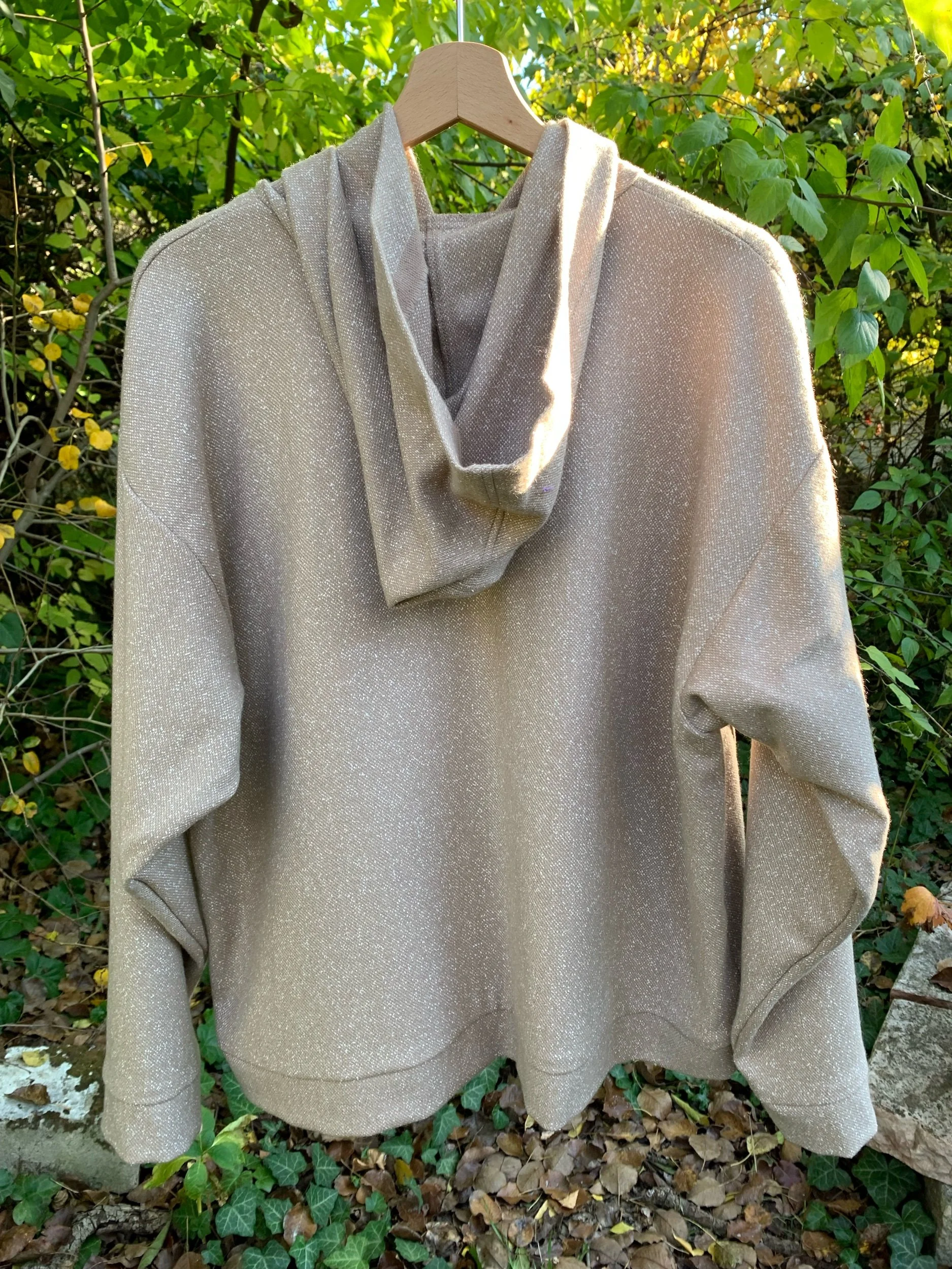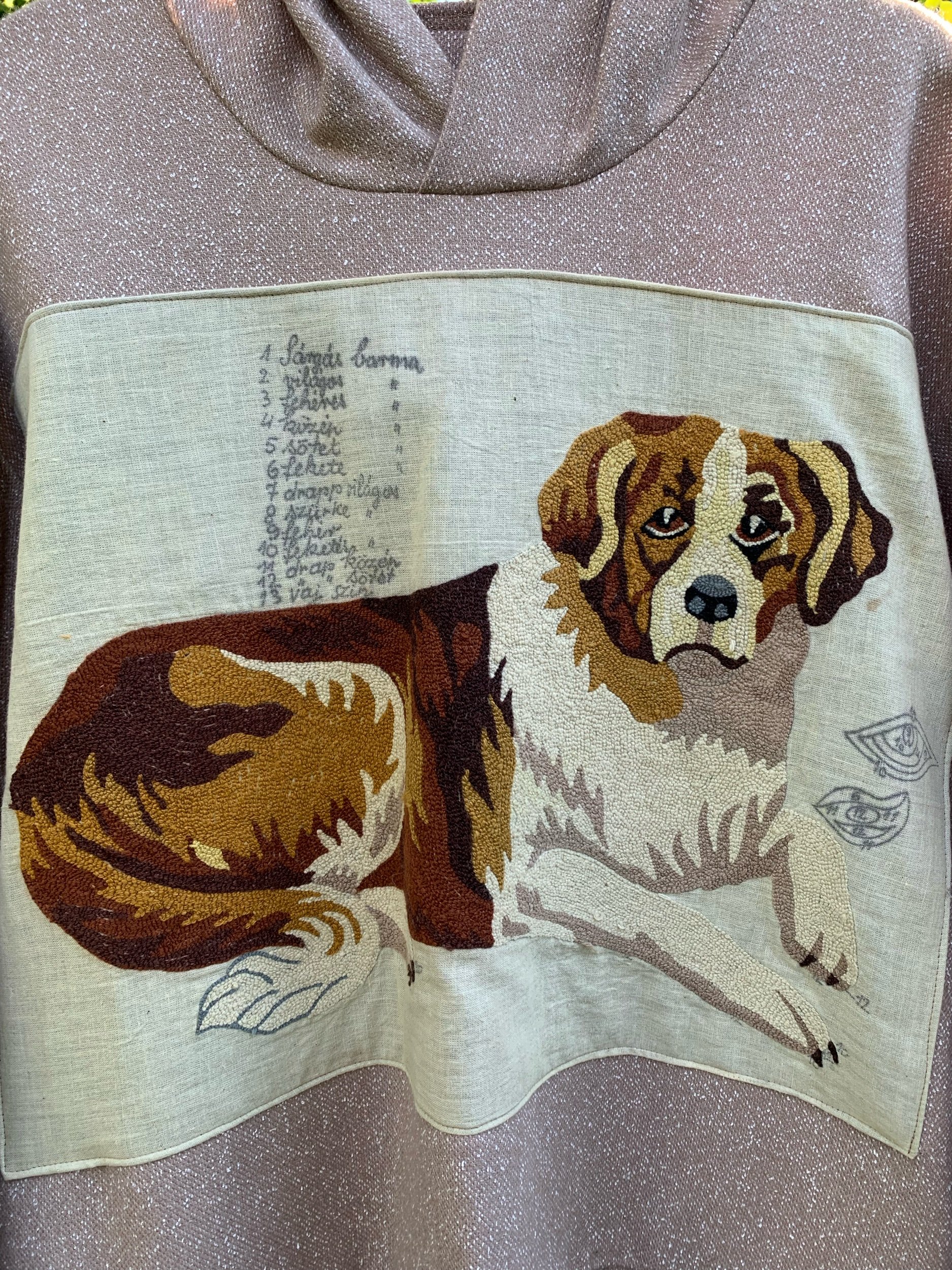 Oversize kapucnis pulover kezzel keszult himzessel. Anyaga gyapju es polyester keverek. Egyedi darab.