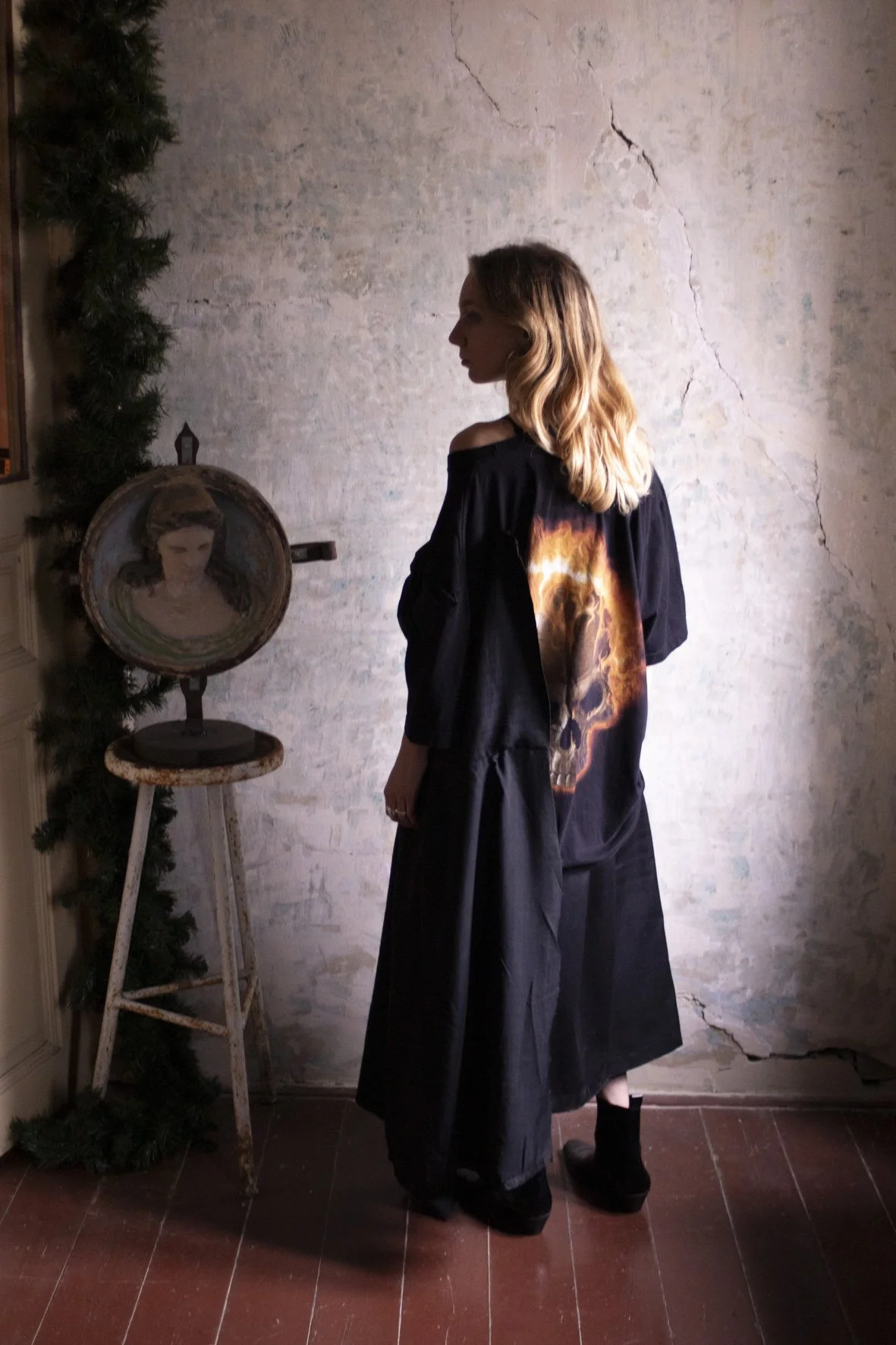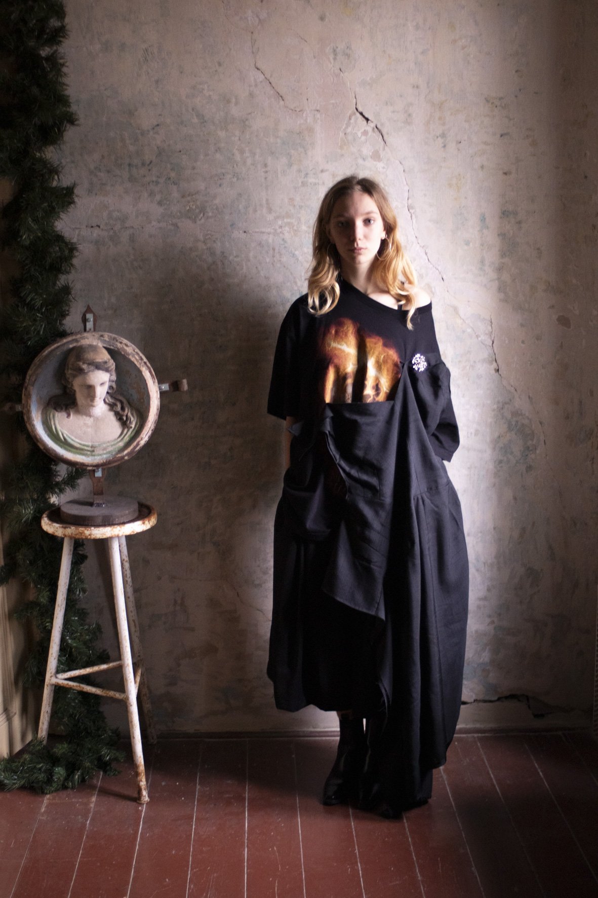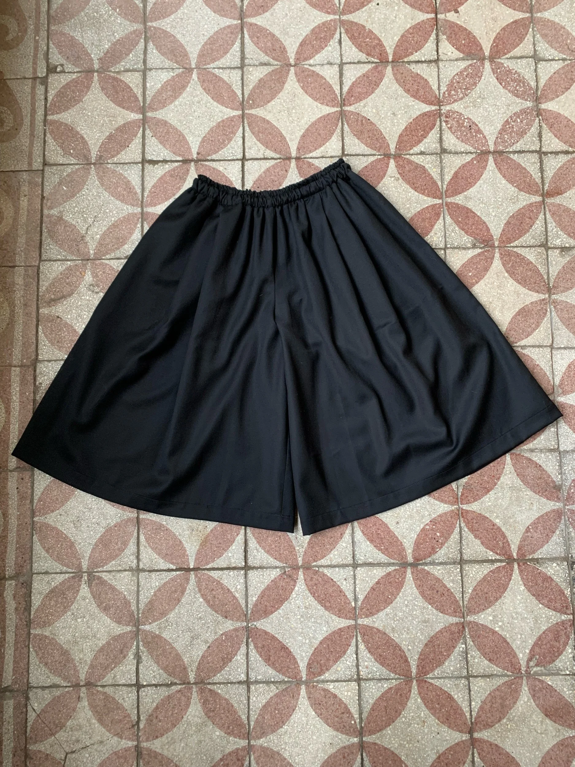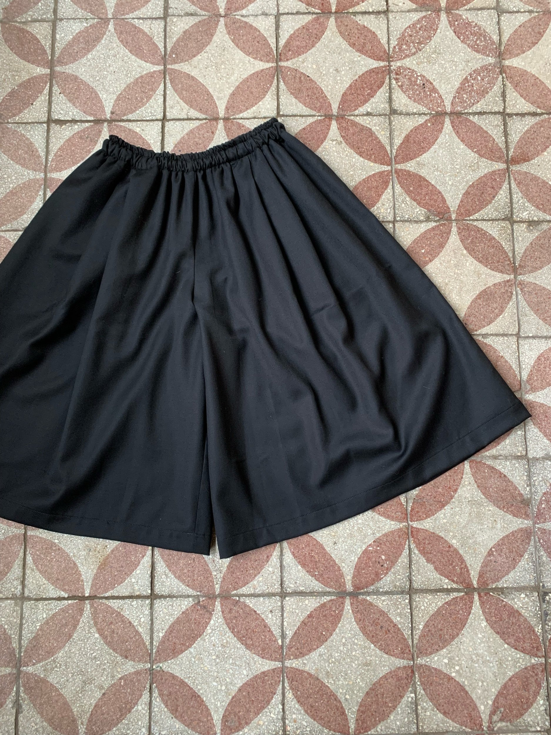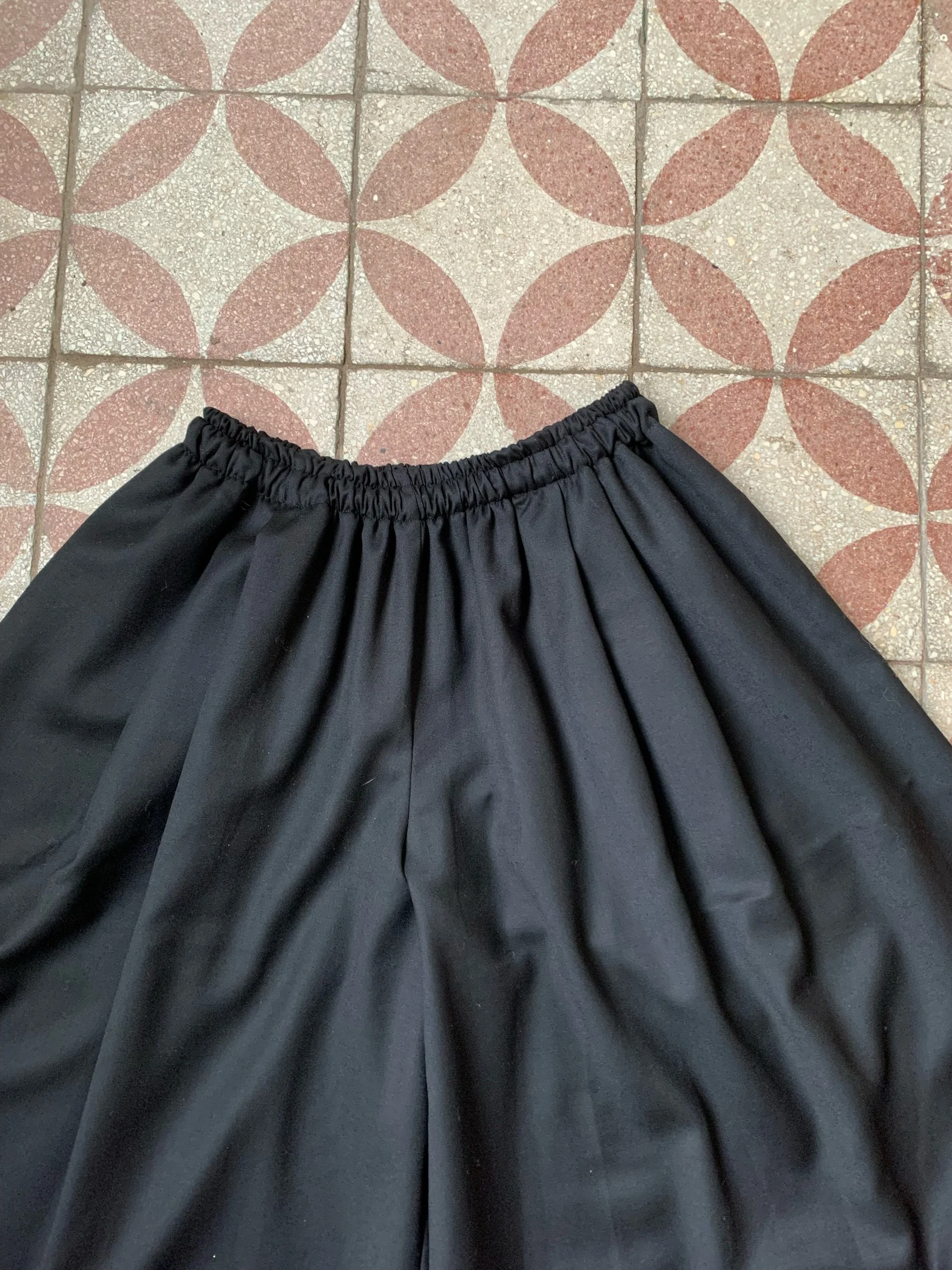 Black trousers with pleats and with elastic waistband. Fabric is wool. This is a unique piece.